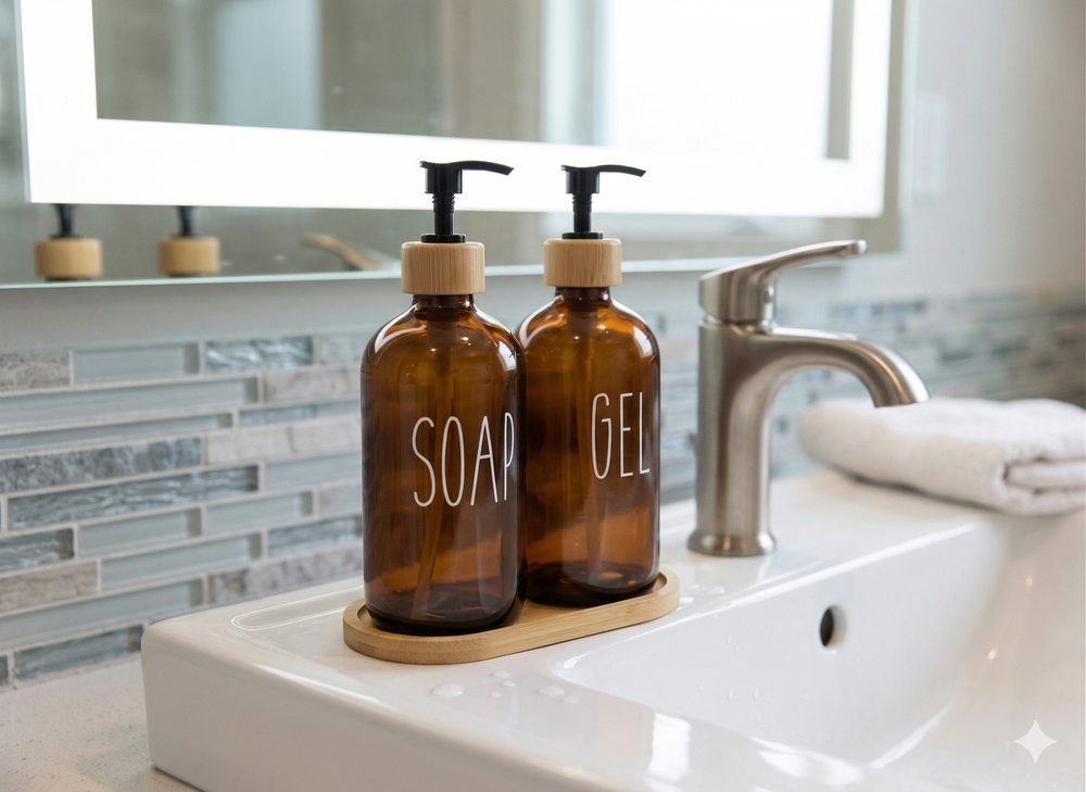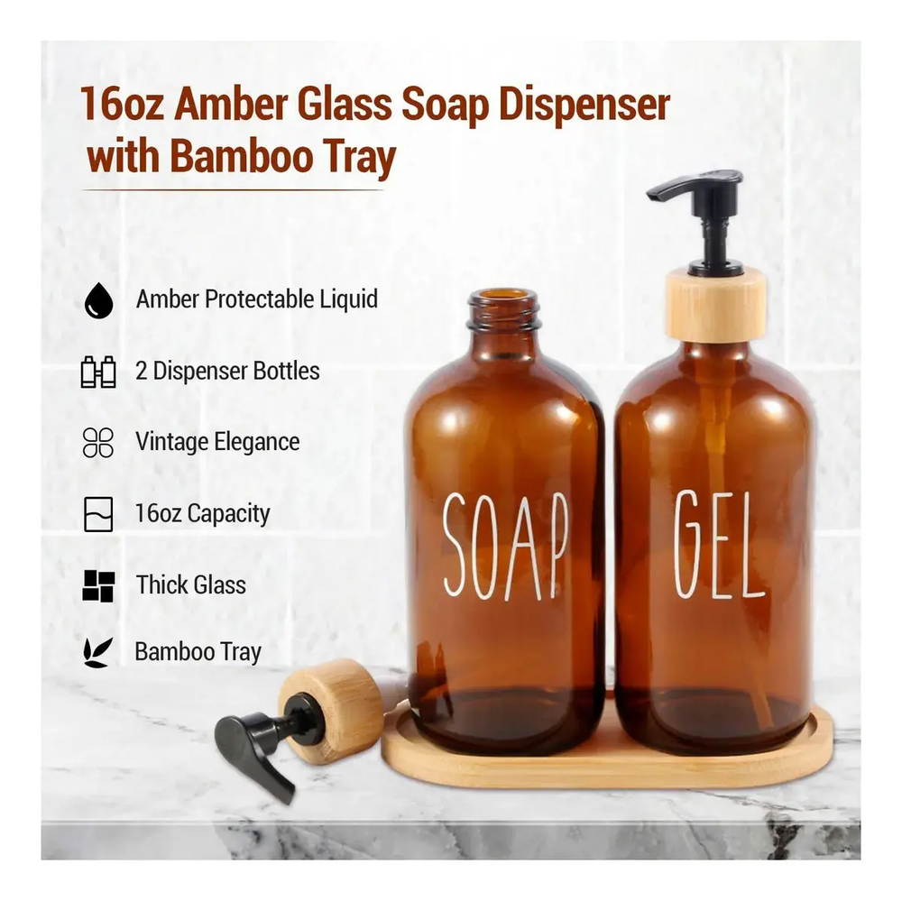 Dispensador de jabón de vidrio con bandeja Amber, una adición elegante y funcional para cualquier baño.