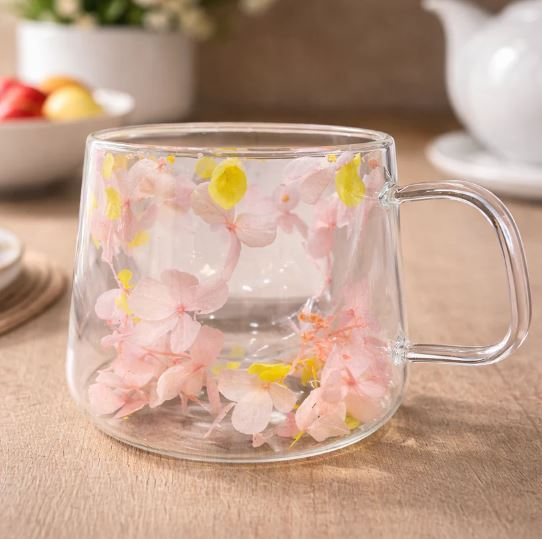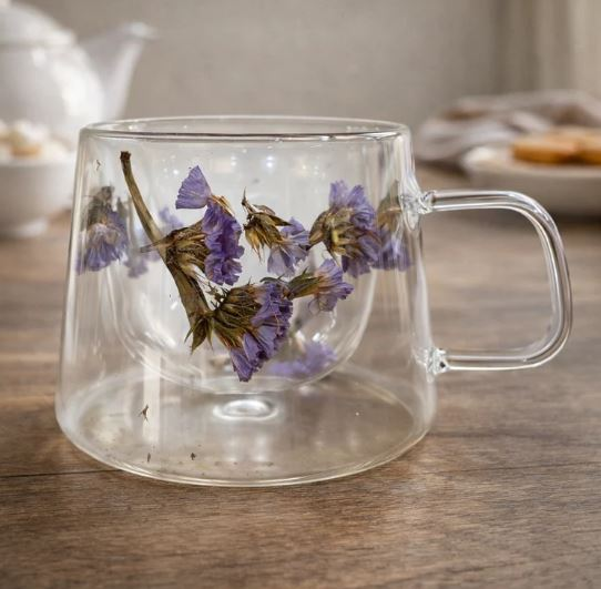 Taza de vidrio de doble pared con flor seca decorativa en su interior. Capacidad de 150 ml. Presentación en caja blanca. Disponible en dos colores surtidos. Ideal para regalo.