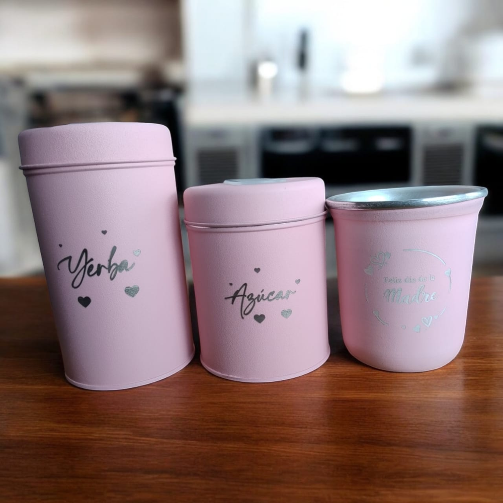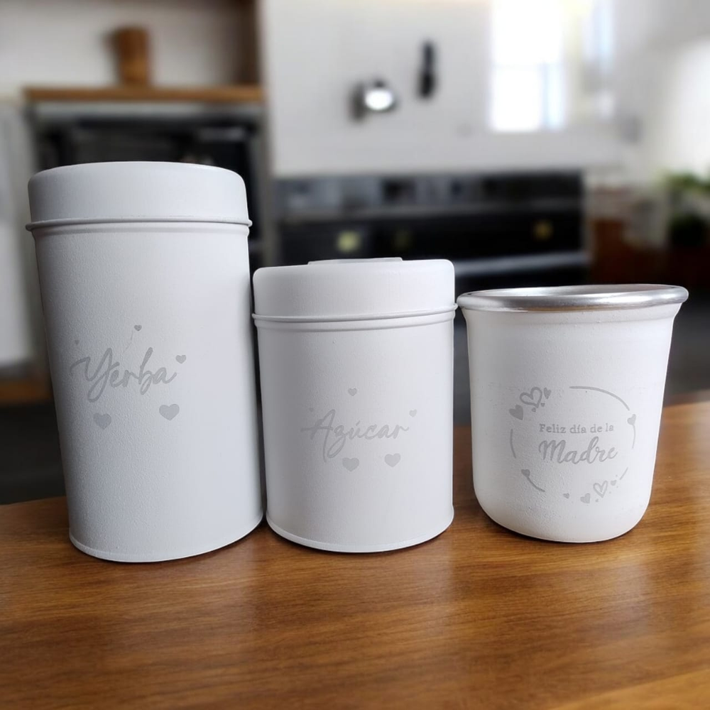 Material: Aluminio Medidas mate. Alto: 9 CM Diámetro Interior: 6 cm Diámetro Exterior: 8 cm Profundidad Interior : 6,5 cm Medidas Yerbera. Alto 14 cm Diametro: 8.5 cm Medidas Azucarera. Alto 10 cm Diametro: 8.5 cm