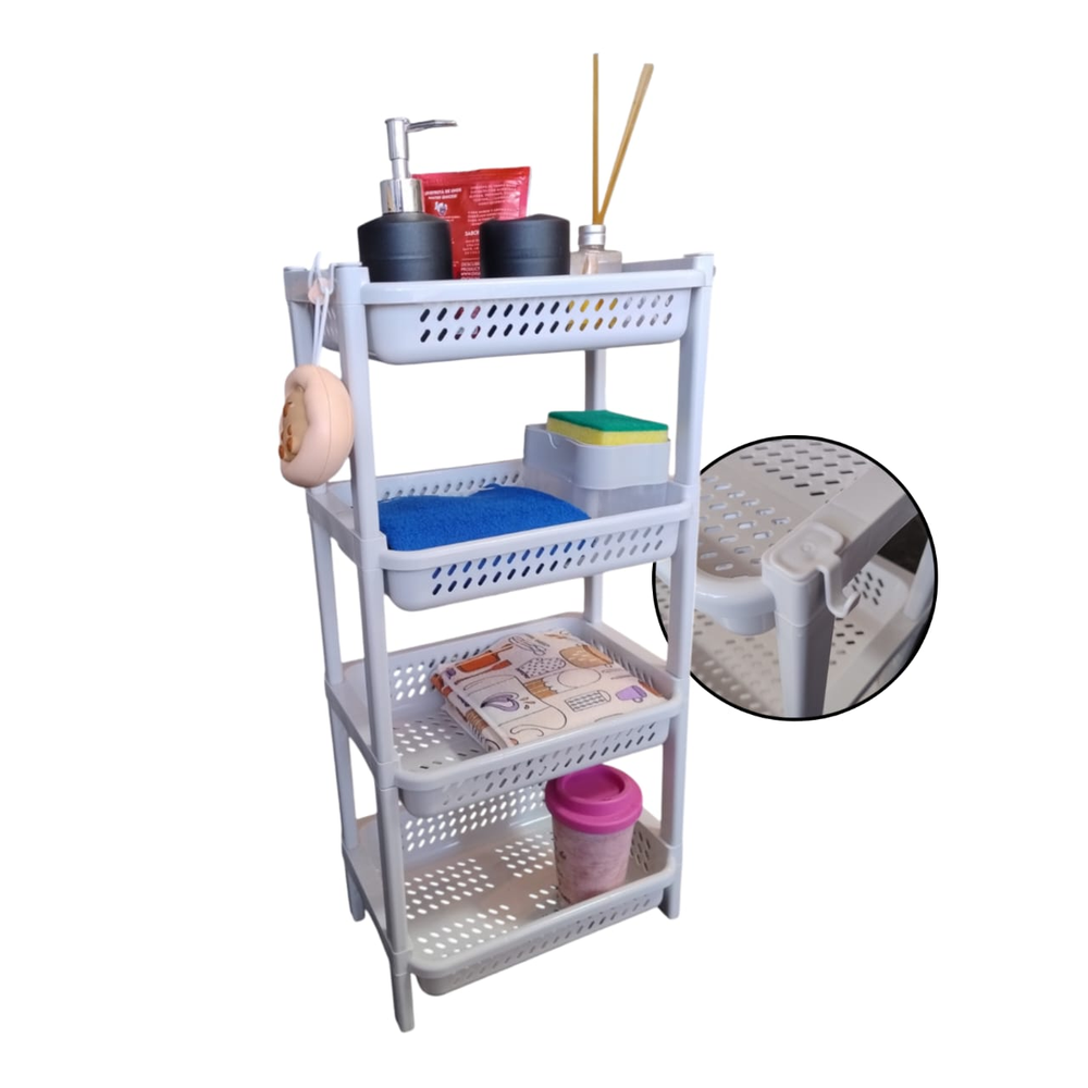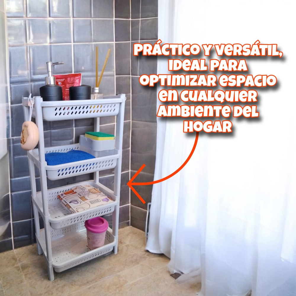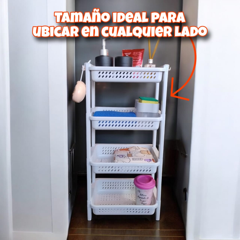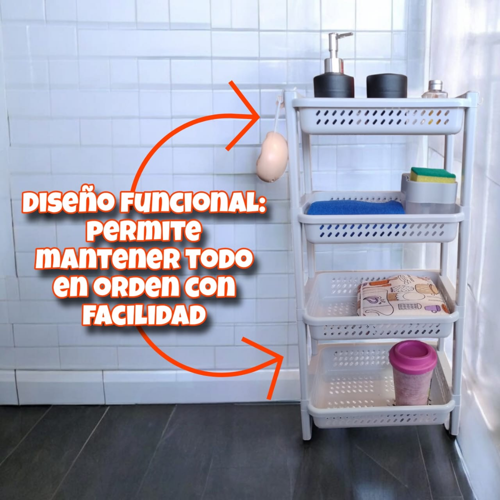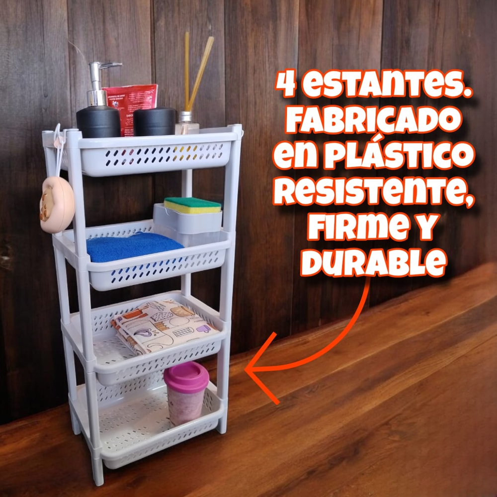 Este organizador de 4 estantes de plástico reforzado maximiza el almacenamiento vertical en la cocina, el baño, el lavadero o la habitación sin ocupar de más. Su diseño liviano pero resistente soporta frascos, toallas, artículos de limpieza y todo lo que necesites tener a mano — ¡Mantené todo visible, ventilado y siempre listo para usar!