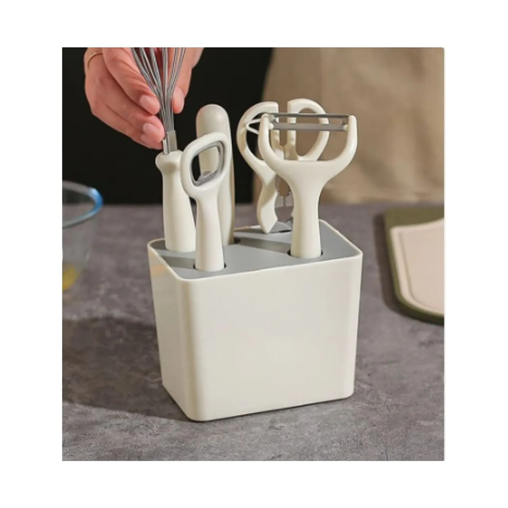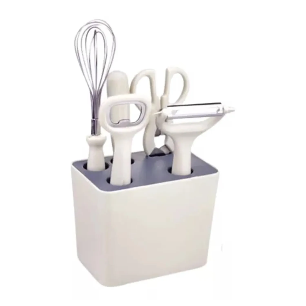 SET DE 5 UTENSILIOS Calidad premium: fabricado con acero inoxidable 304 de grado alimenticio, el juego de 6 piezas incluye un pelador, abridor de botellas, agitador, cuchillo de frutas, tijeras y base de almacenamiento decorativa.