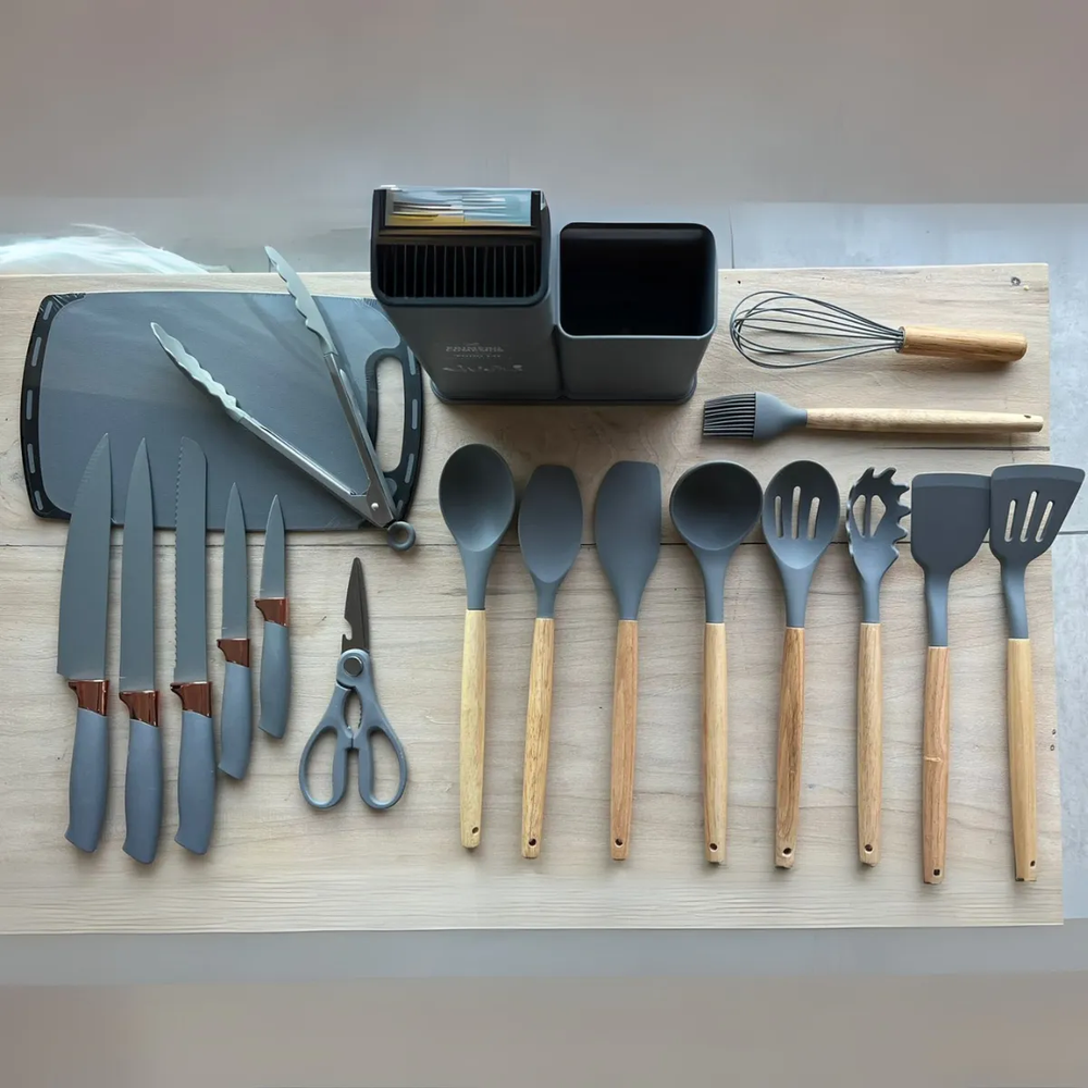 Los utensilios están hechos de silicona de alta calidad, lo que garantiza su durabilidad y resistencia al calor. El mango de madera ofrece elegancia y comodidad durante el uso. Con un diámetro de 3 cm y una longitud total de 30 cm, estos utensilios tienen el tamaño adecuado para todas tus necesidades culinarias.