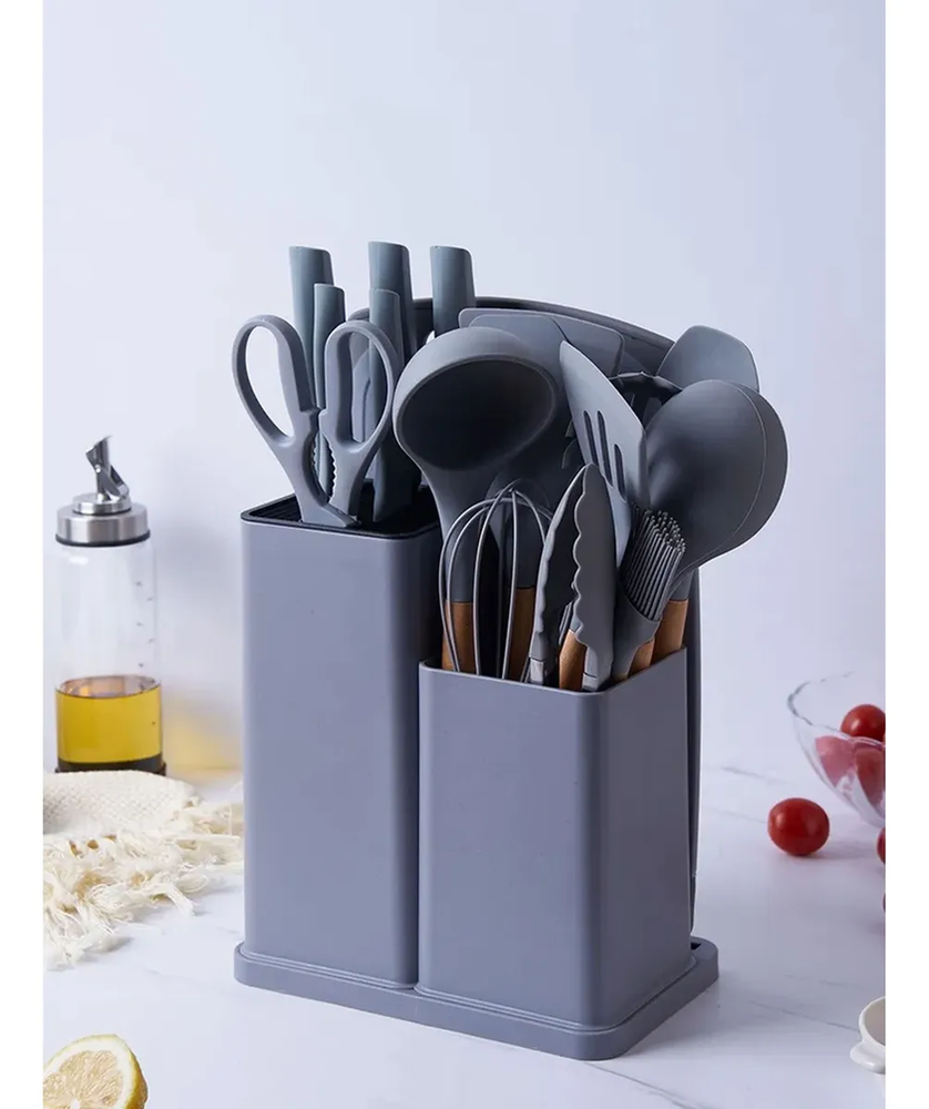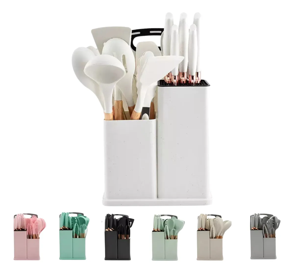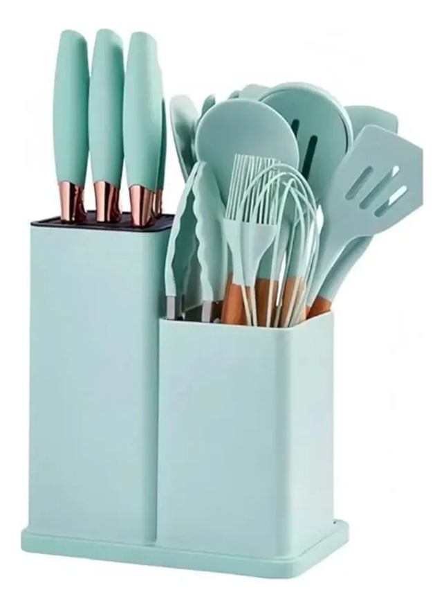 Juego Kit De Utensilios Silicona Cocina Cuchillos 19 Piezas El juego con 19 utensilios de cocina de silicona Shell Palet de color turquesa es la combinación ideal de funcionalidad y estilo, con un diseño moderno y atractivo que añadirá un toque de color a tu cocina.