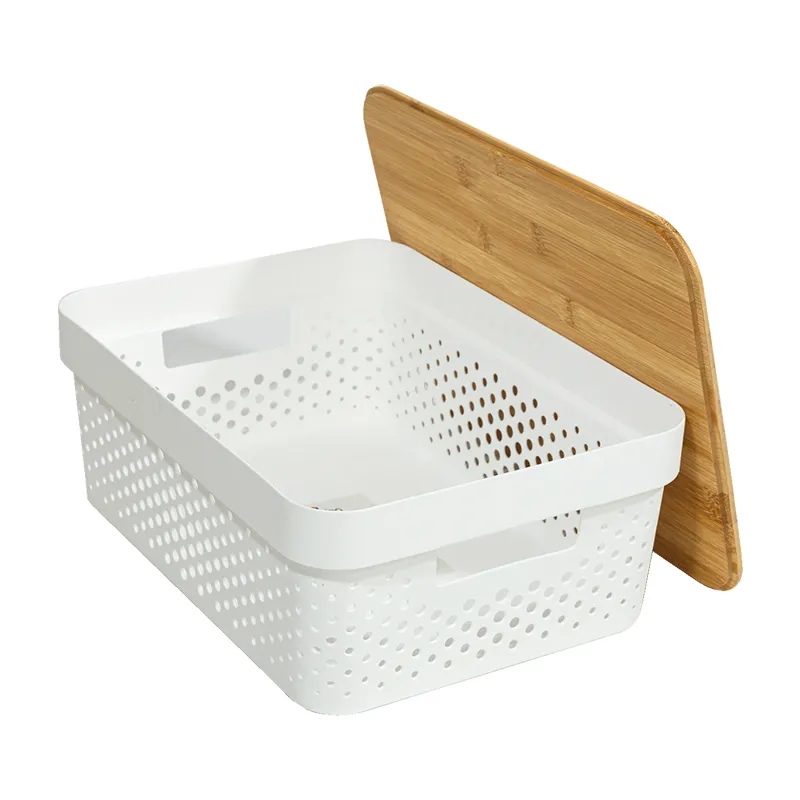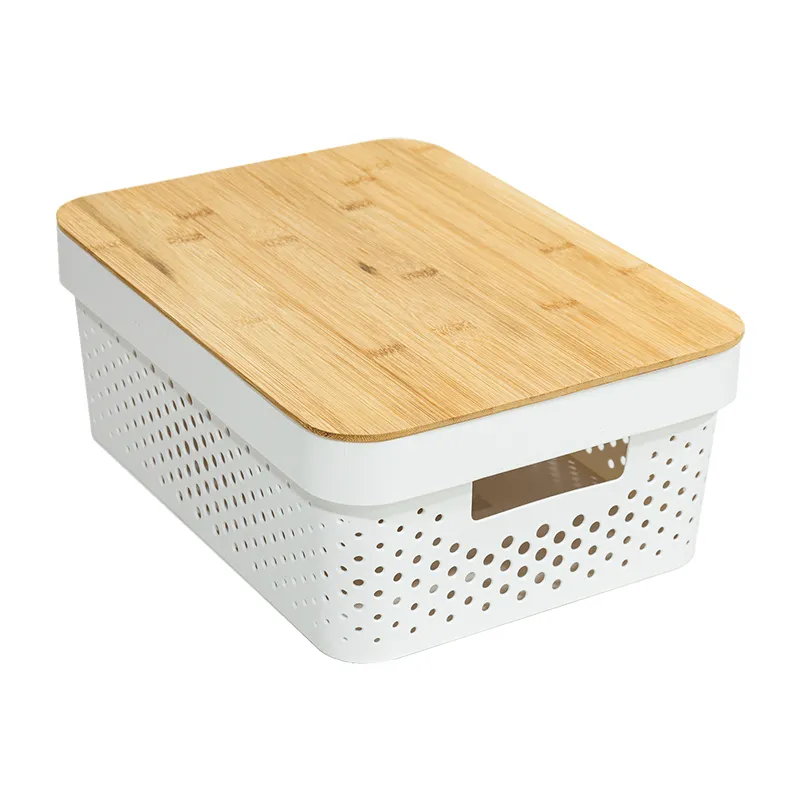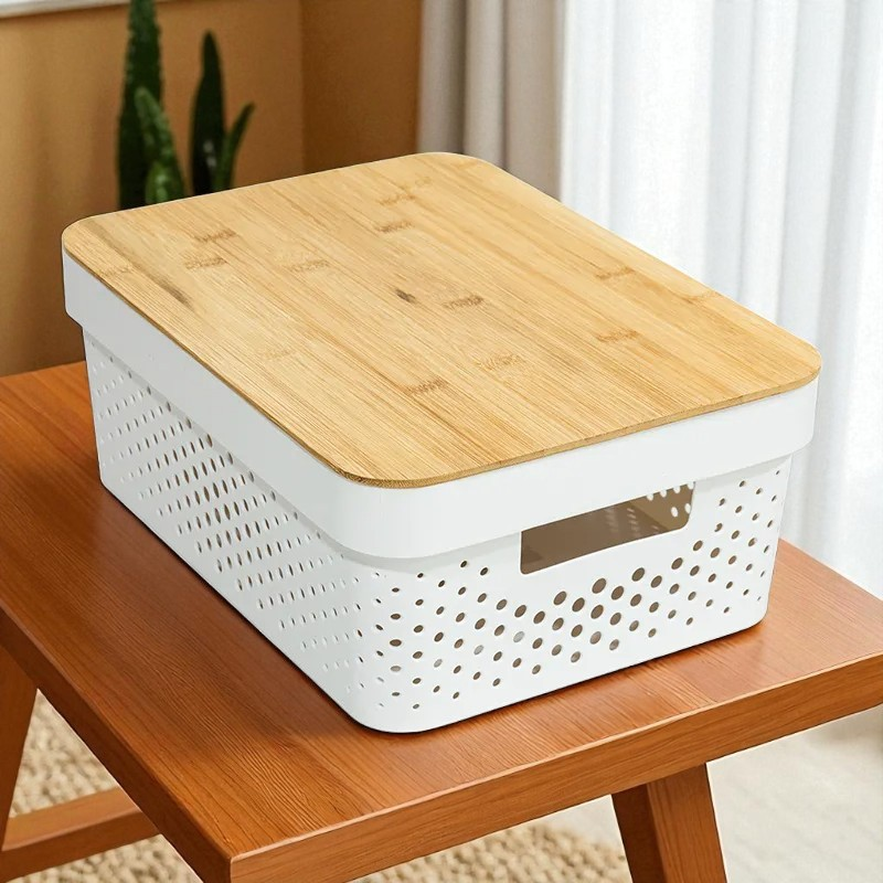 CAJA DE PLASTICO CON TAPA BAMBU NORDICA (M) OSLO Un producto ideas para decorar y organizar todo tipo de ambientes. Apilables. Ambientes: BAÑO – COCINA – DORMITORIO – OFICINA Materiales: PLÁSTICO MEDIDAS ANCHO: 36 cm PROFUNDIDAD: 27 CM ALTO: 14 cm