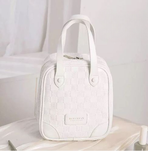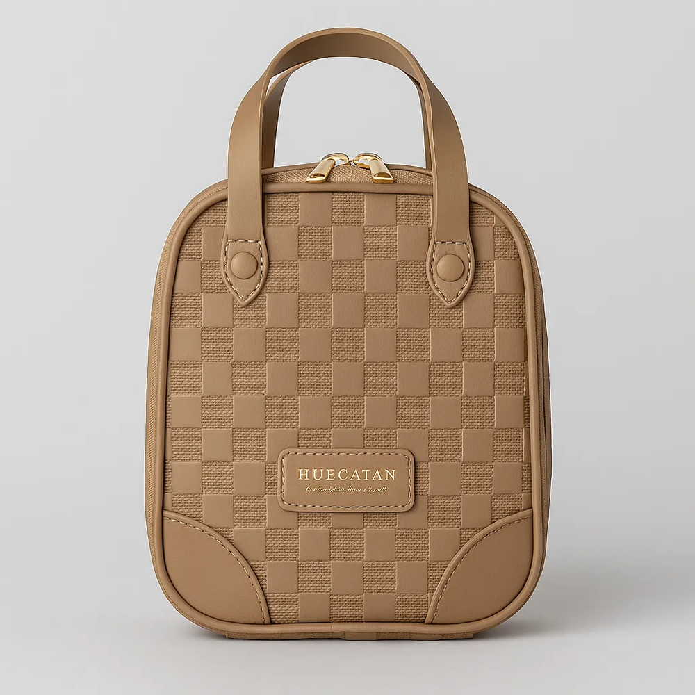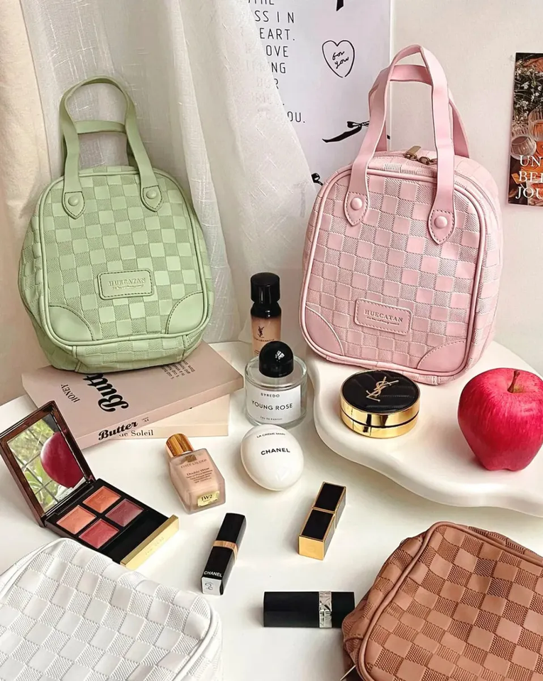 Portacosmético liviano y versátil, con exterior de goma flexible y textura tramada tipo checkerboard. Ideal para llevar maquillaje, útiles, accesorios o incluso usar como mini bolso urbano.