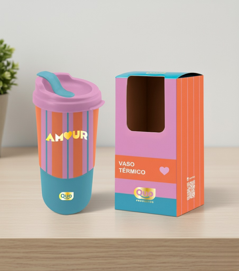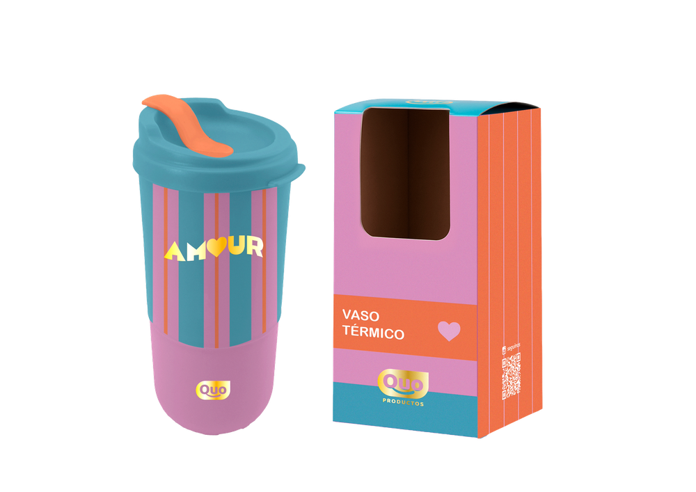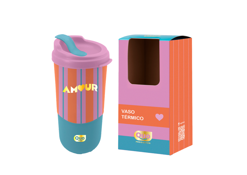 Vaso térmico doble pared “Amour” – edición especial ideal para sumar color a tu vidriera o tienda online. Fabricado en plástico resistente libre de BPA, mantiene la temperatura de bebidas calientes por más tiempo. Capacidad aproximada: 350 ml. Su tapa a presion con pico y tapa de silicona evita derrames, ideal para usar en la oficina, el auto o llevar en la mochila. Colores vibrantes con diseño rayado y frase “Amour”, perfecto para regalar en San Valentín, Día de la Madre o fechas especiales. Alta rotación garantizada gracias a su presentación llamativa y packaging individual listo para exhibir en estantes o góndolas. Producto ideal para potenciar tus ventas en campañas temáticas o como opción de regalo económico y funcional.