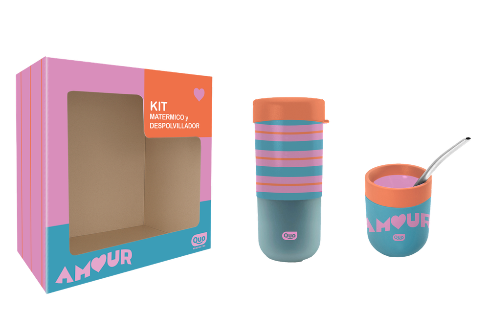 El regalo perfecto para quienes aman el mate y el color. Este kit completo en la línea "Amour" incluye el Despolvillador (para un mate sin polvo), un Mate de diseño llamativo y una Bombilla de metal, todo coordinado en vibrantes tonos verde azulado, rosa y naranja.