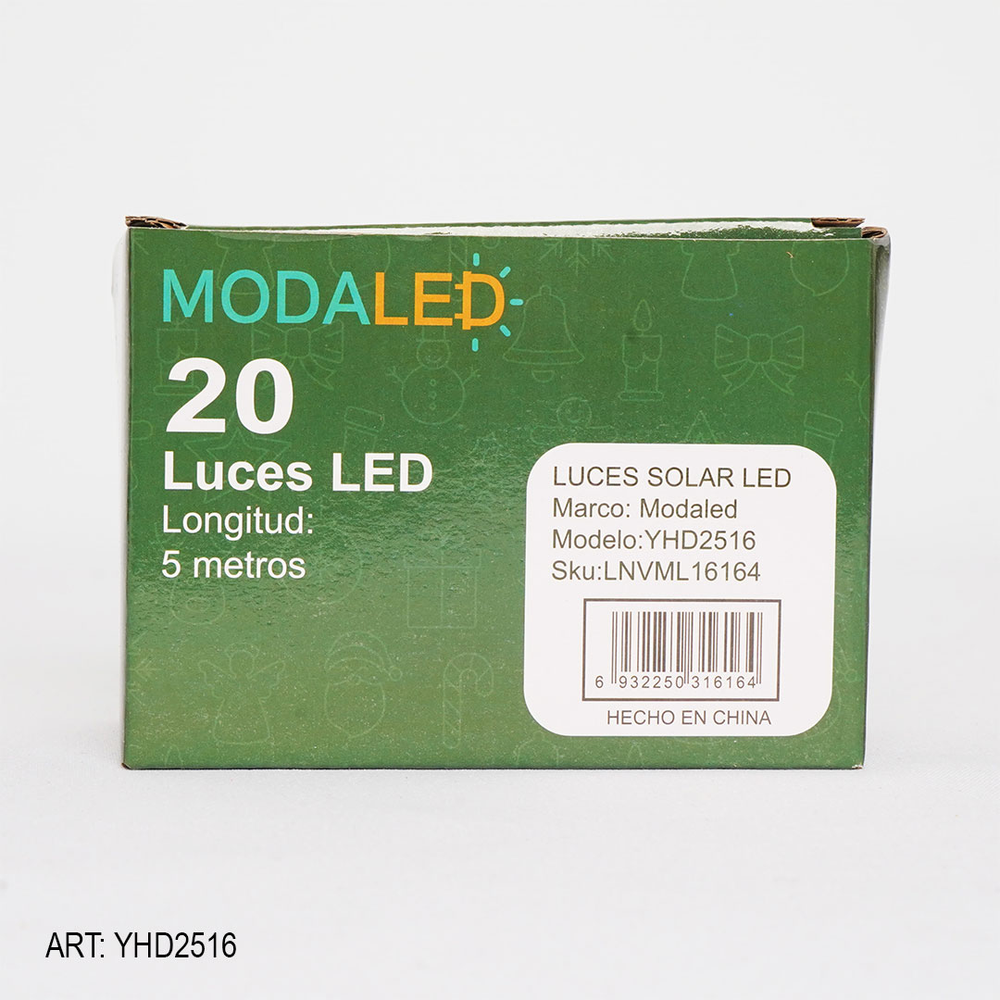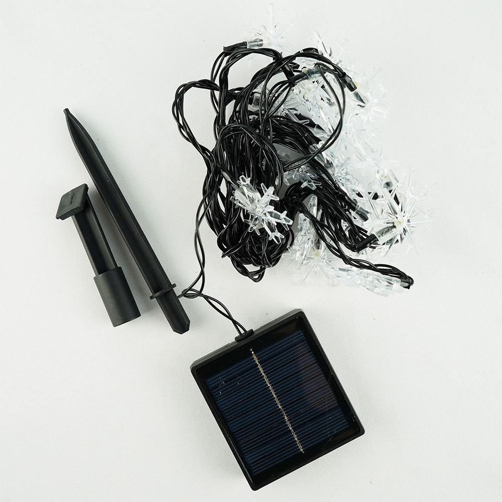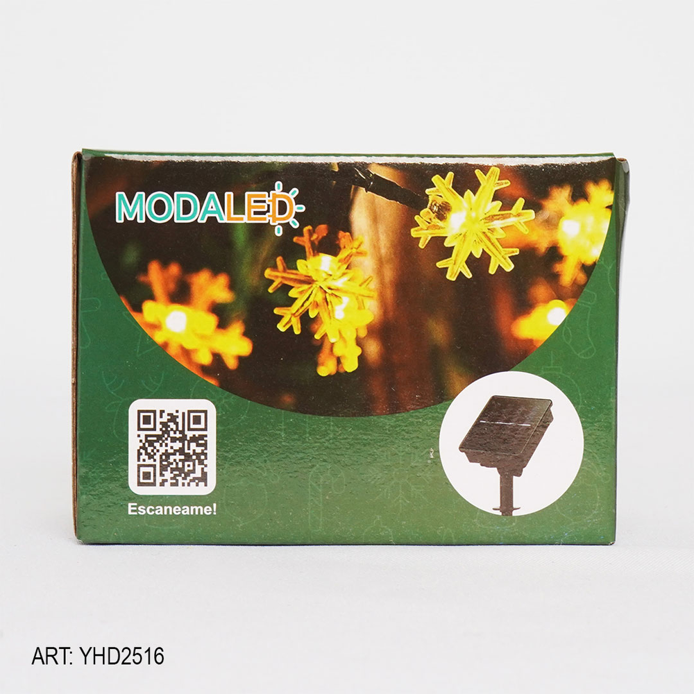 Número de LED: 20 Forma: Copo de nieve Longitud de la línea: 5 metros, Tiempo de carga: 6 - 8 horas. Horas de trabajo: 8 a 12 horas Conexión: Solar Medidas: 5mts largo Focos brillantes. Bajo consumo de energia.