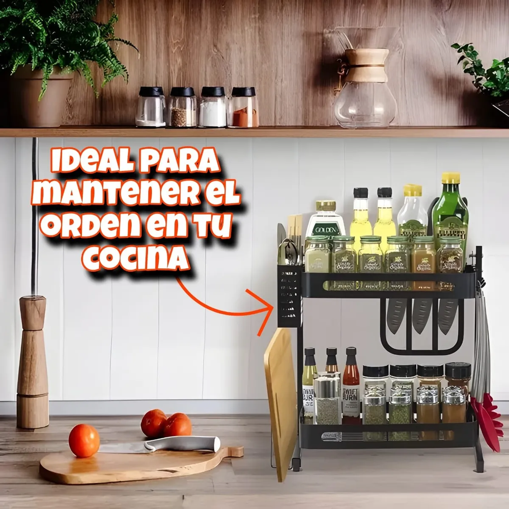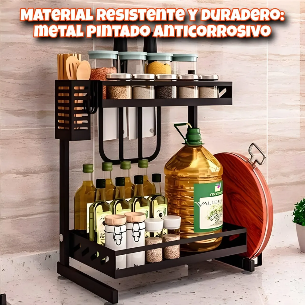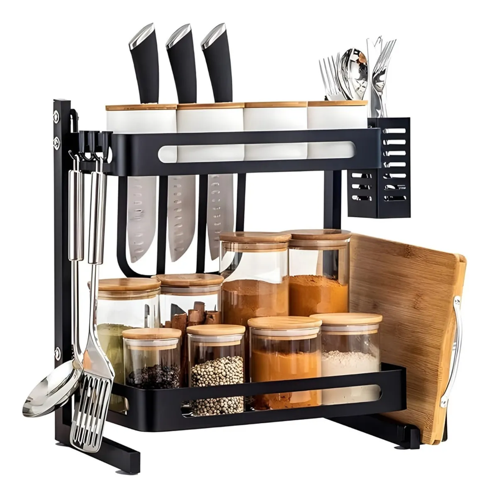 Organizador cocina, estante 2 niveles metal, rack condimentos, especiero metálico, organizador de mesada, porta utensilios, porta cuchillos, soporte para tabla, organizador alacena, organizador negro anticorrosivo.
