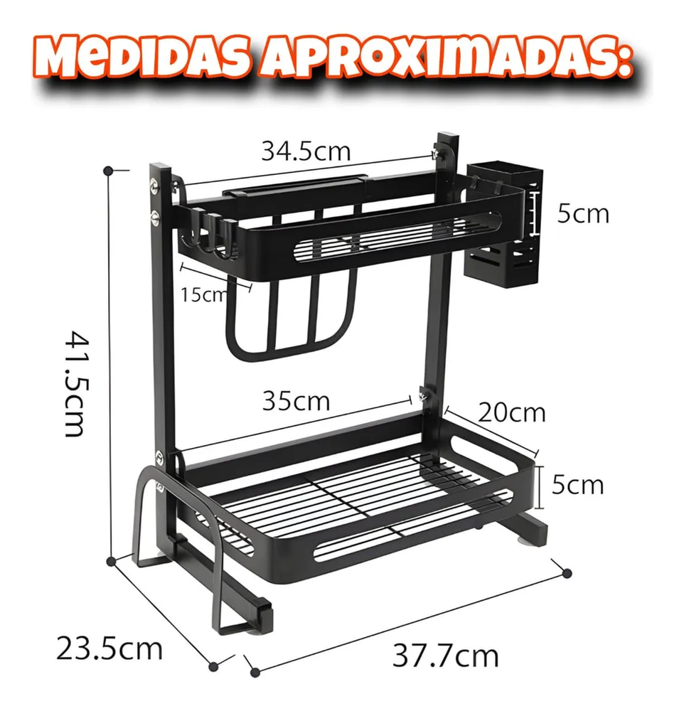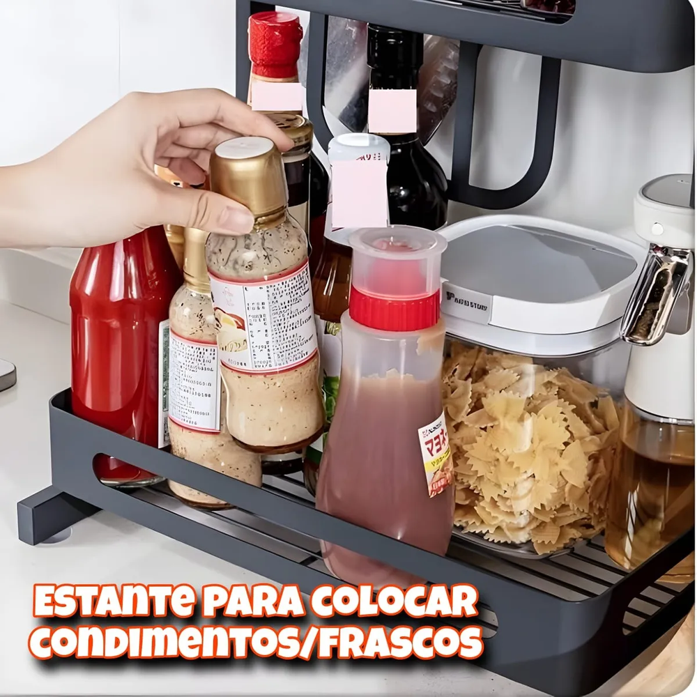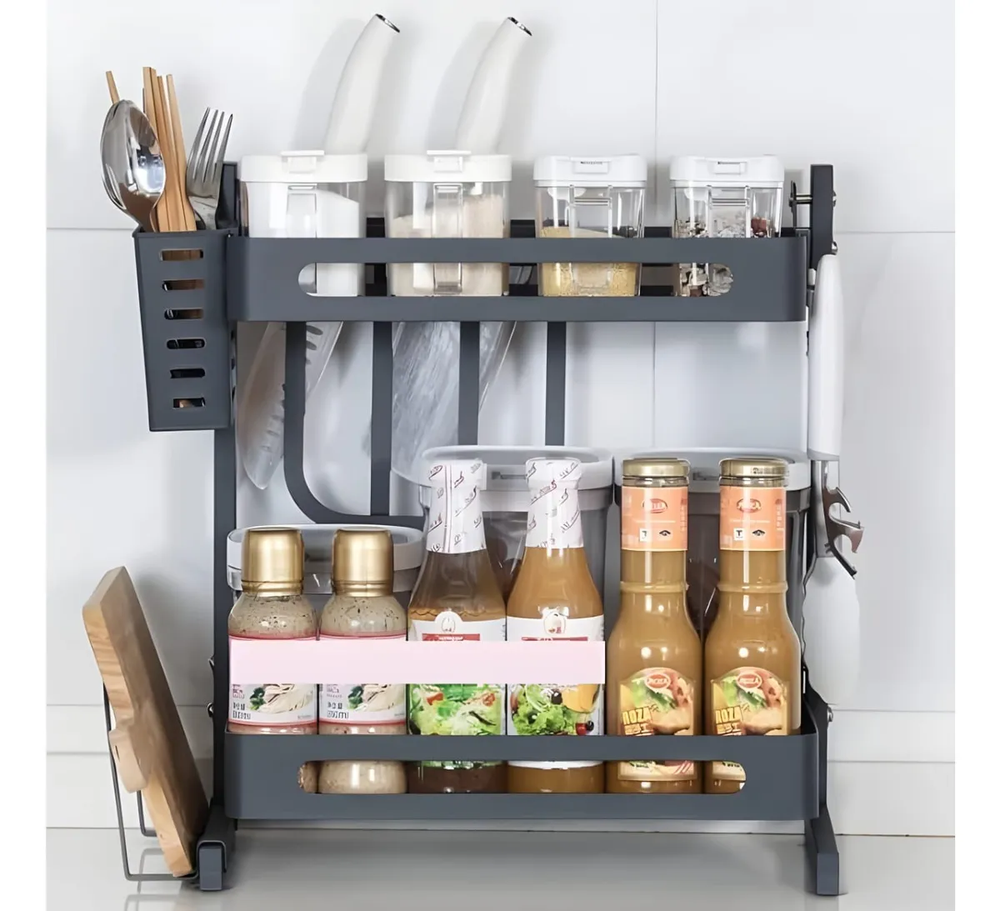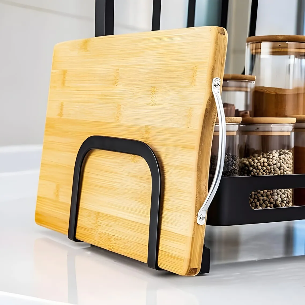 Organizador cocina, estante 2 niveles metal, rack condimentos, especiero metálico, organizador de mesada, porta utensilios, porta cuchillos, soporte para tabla, organizador alacena, organizador negro anticorrosivo.