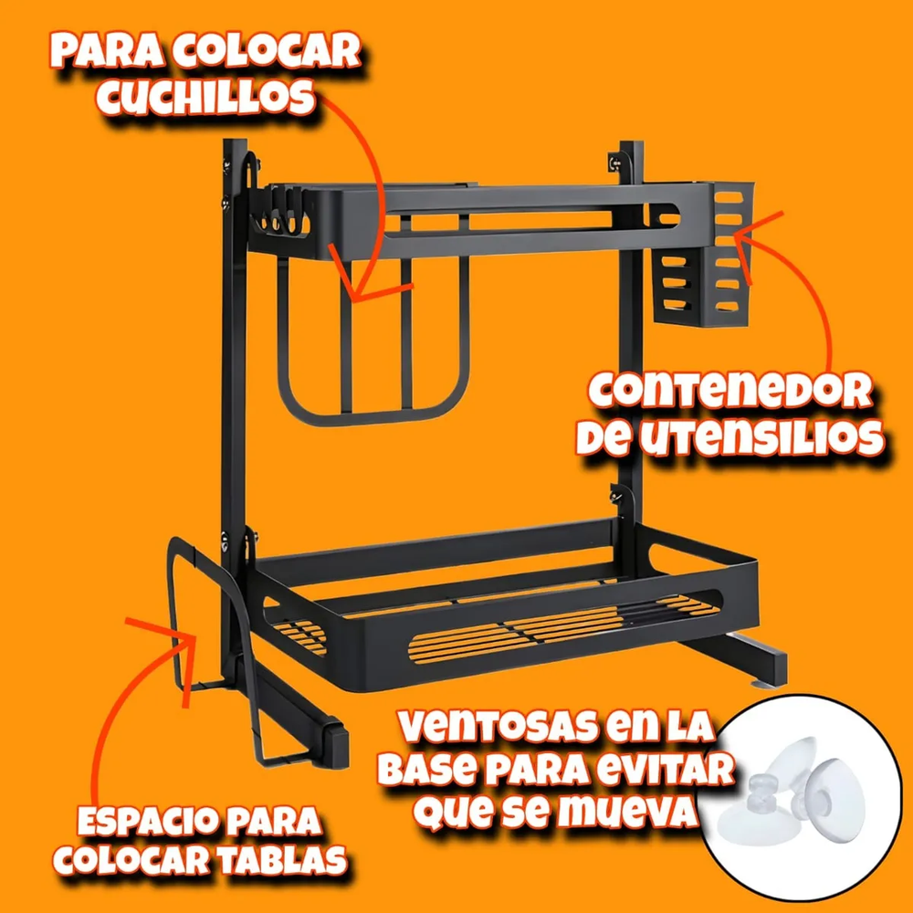 Pensado para el uso diario: estructura robusta en metal pintado anticorrosivo, base estable con ventosas antideslizantes y bordes de contención que evitan caídas. Incluye porta cuchillos seguro, porta utensilios lateral, ganchos para colgar accesorios y soporte para tabla o tapa, así cada elemento tiene su lugar.