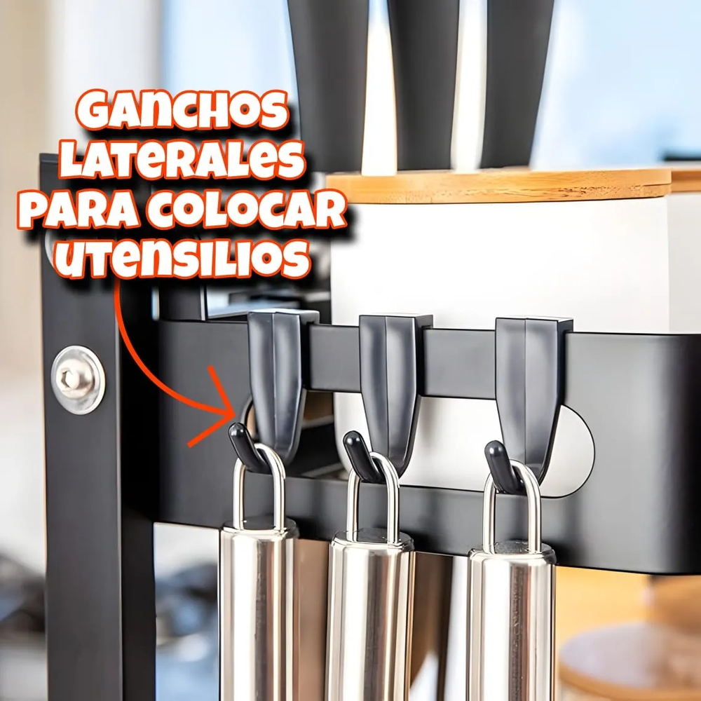 Accesorios integrados: porta cuchillos, porta utensilios, ganchos laterales y soporte para tabla/tapa.