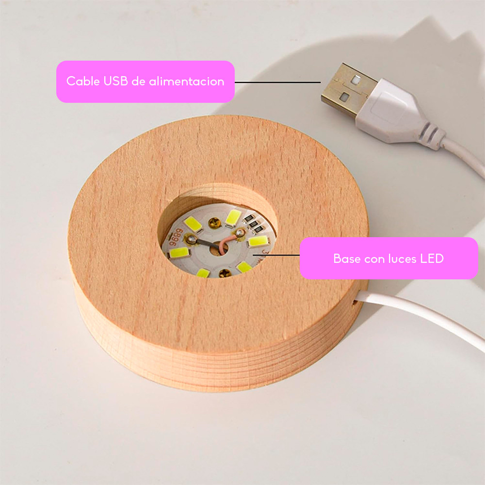 Su base de madera natural aporta un toque rústico y elegante que combina con cualquier estilo de decoración. Conectala por USB, apoyá la esfera… ¡y dejate envolver por la magia natural!