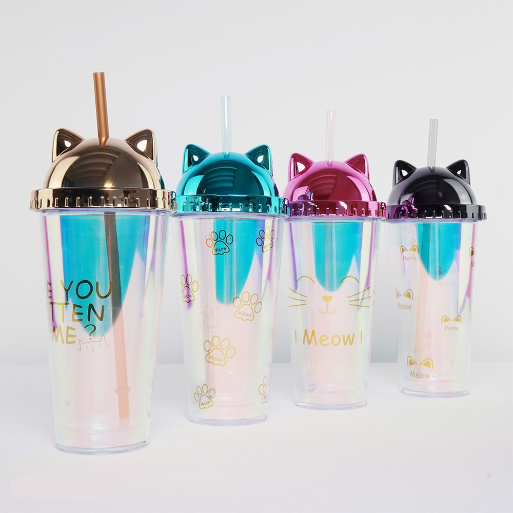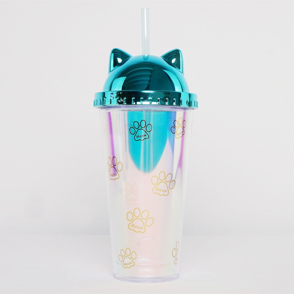 VASO TORNASOLADO CON DISEÑO DE GATO Y SORBETE.