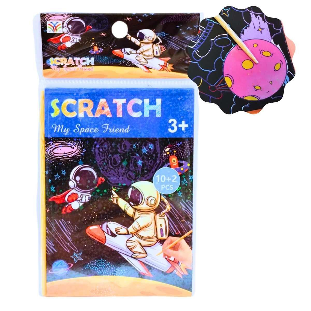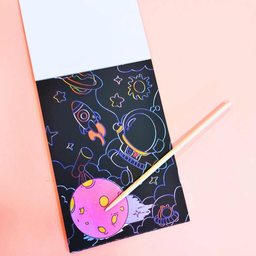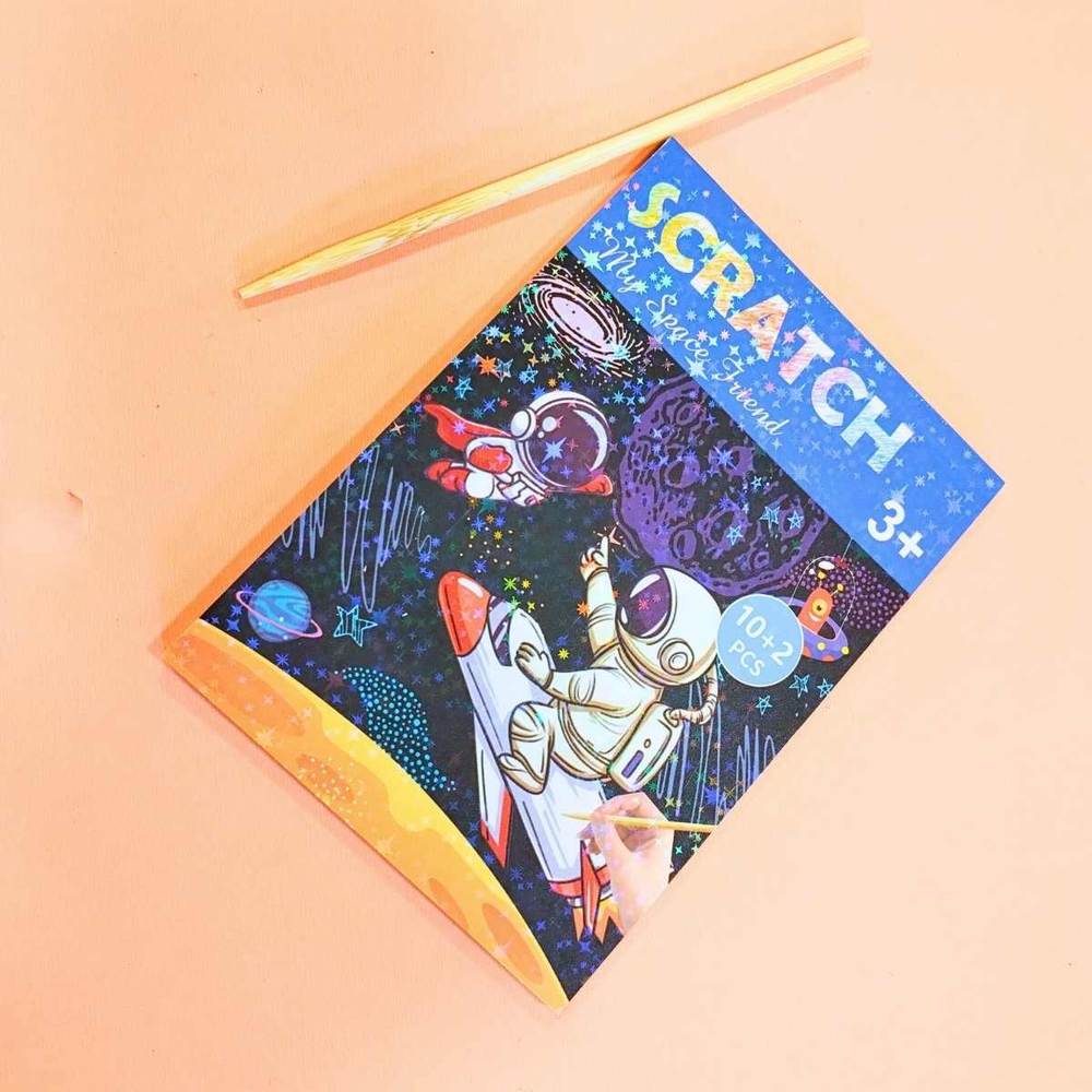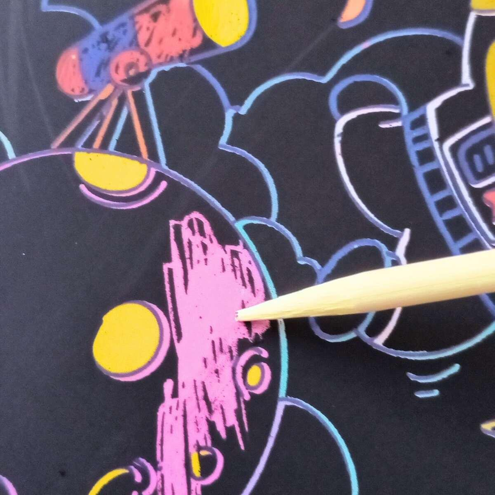 Papel Magico Espacial - 10 + 2 hojas c/lapiz ! Este set de Papel Mágico Multicolor incluye hojas negras especiales que al rayarse con el lápiz de madera incluido, revelan un fondo colorido. Viene con imagenes espaciales para colorear. Hecho en papel de alta calidad, es perfecto para niños y adultos que disfrutan del arte y el dibujo.