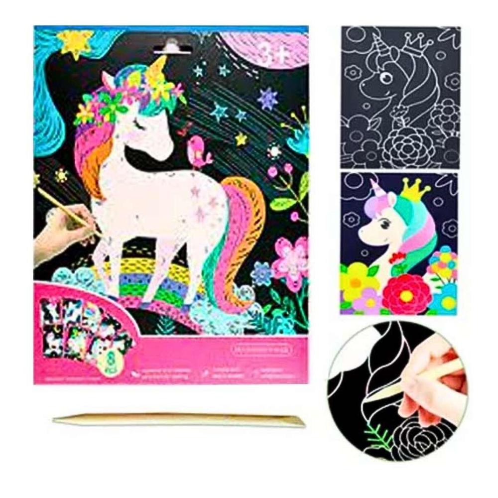 Papel Magico Unicornio c/lapiz bamboo - 8 hojas. Este set de Papel Mágico Multicolor incluye hojas negras especiales que al rayarse con el lápiz de madera incluido, revelan un fondo colorido. Viene con imagenes de unicornio para colorear. Hecho en papel de alta calidad, es perfecto para niños y adultos que disfrutan del arte y el dibujo.