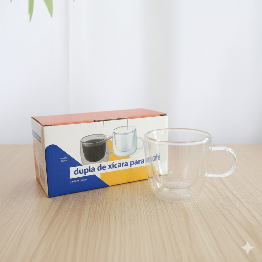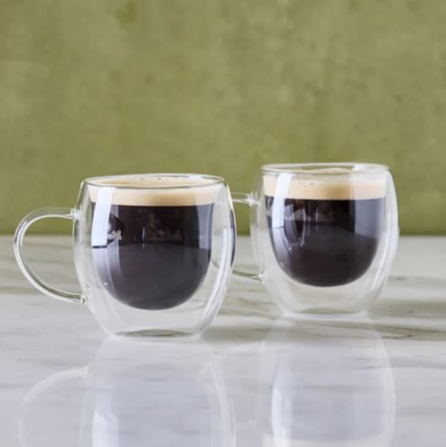 Set de 2 tazas de vidrio doble de 80 ml. Ideales para espresso, café corto o infusiones concentradas. Aportan un toque delicado y funcional a cualquier cocina.