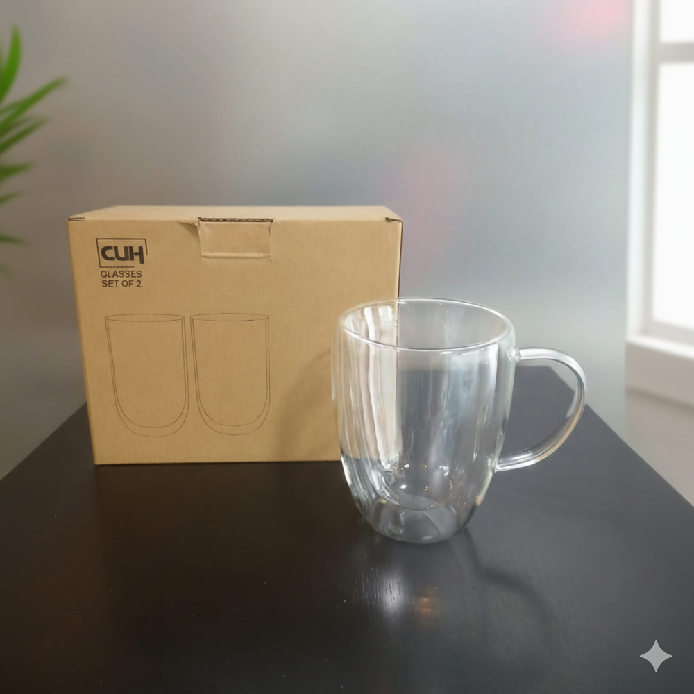 Set de 2 tazas de vidrio doble con manija y capacidad de 300 ml. Cómodas y funcionales, ideales para café, té o chocolate caliente. Diseño clásico para uso diario.