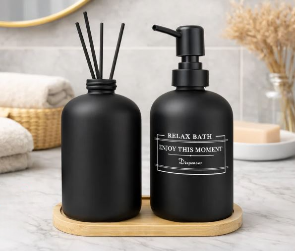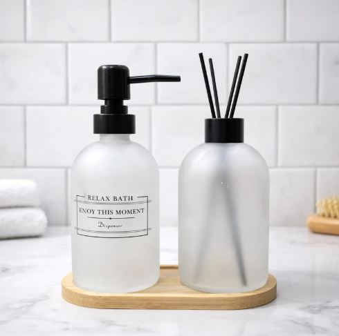 Set de Dispenser de jabon vidrio con dosificador de plastico + botella difusora de aroma de Vidrio. Incluye plato de madera.