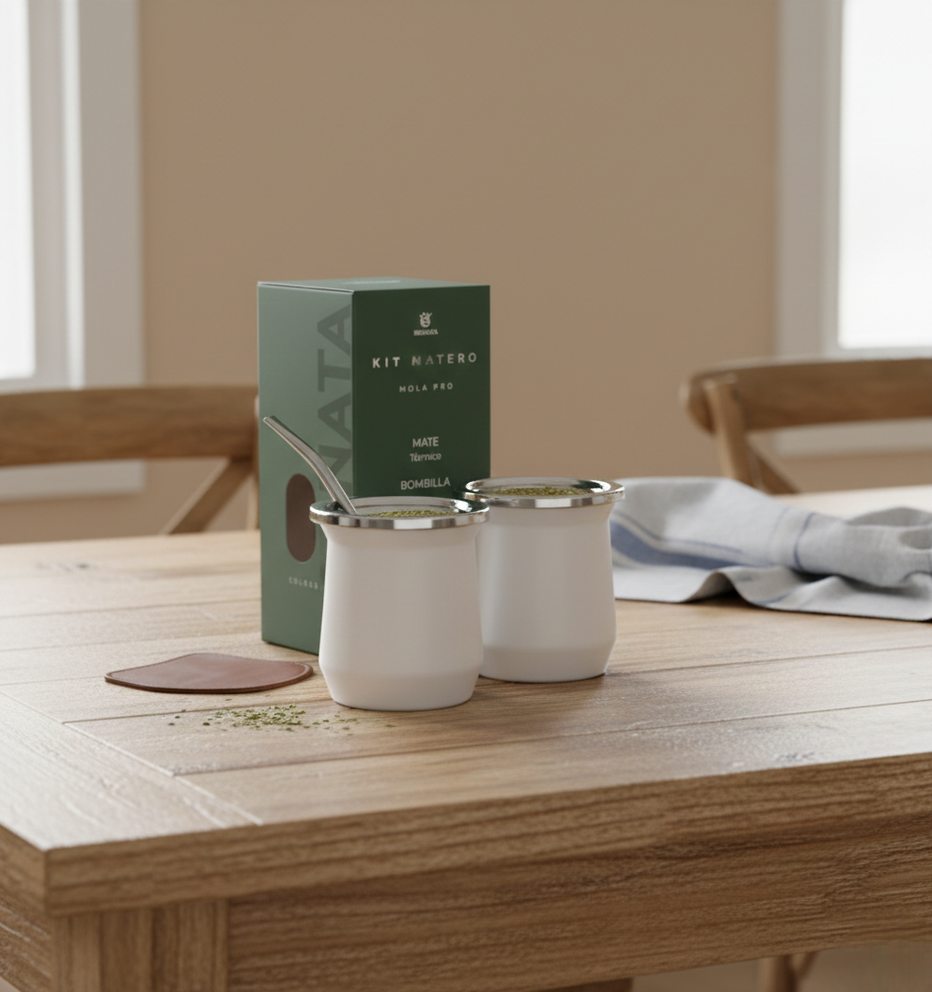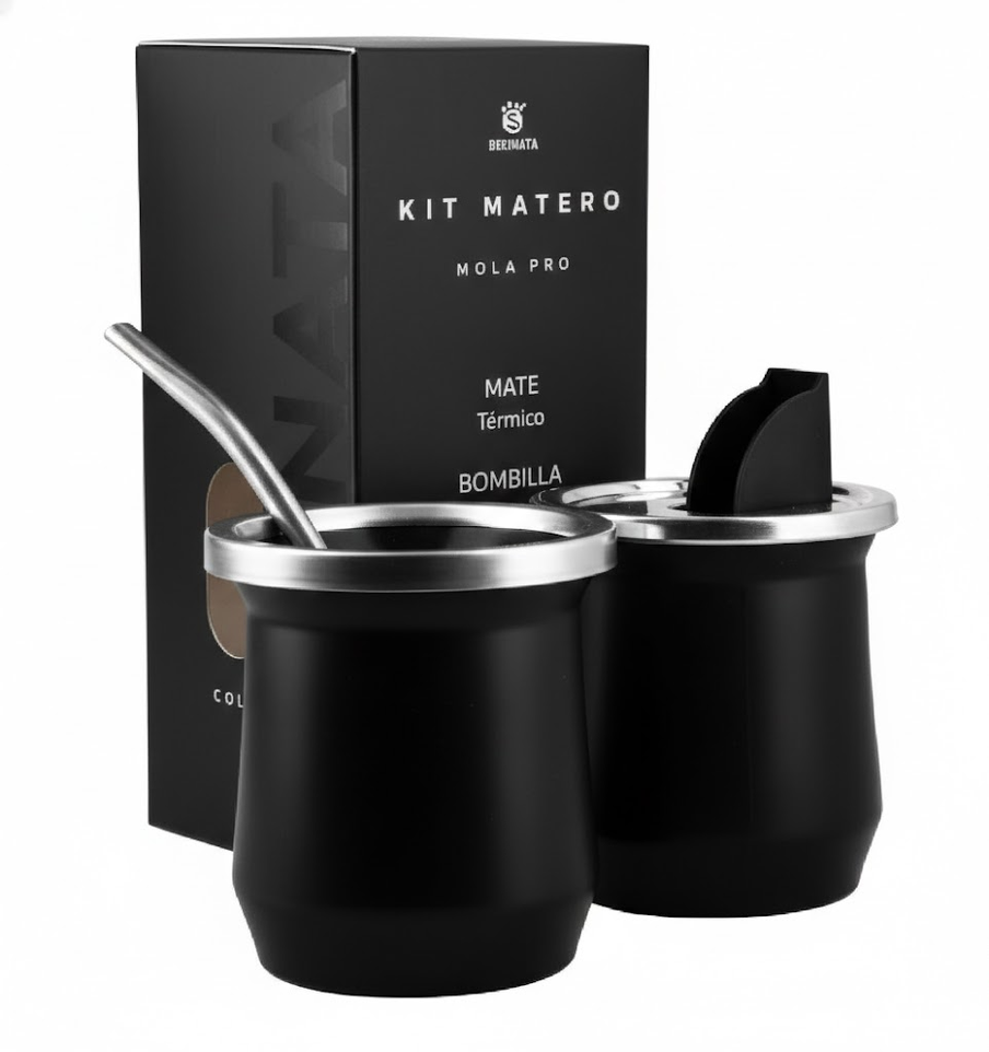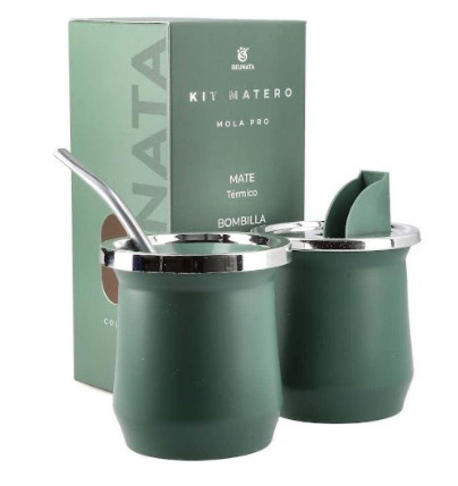Presentación: Kit con packaging incluido en Caja. Características del producto: Apto alimentos (Polipropileno) Mate: Doble pared, aísla la temperatura Bombilla color: Aluminio pintada plateado con resorte niquelado