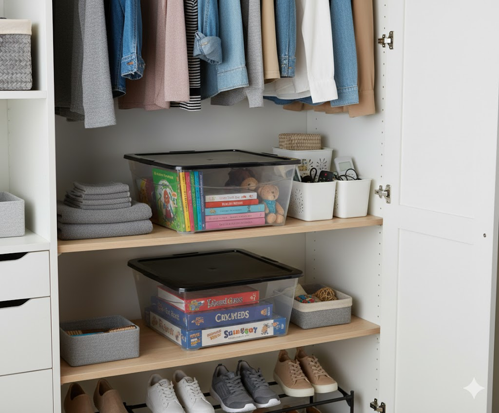 Caja organizadora de plástico con tapa, apilables multiproposito. Capacidad de 20lts. Ideal para organizar tu hogar, guardar zapatos, accesorios. Su diseño transparente permite identificar el contenido rápidamente, facilitando el acceso a tus objetos esenciales.