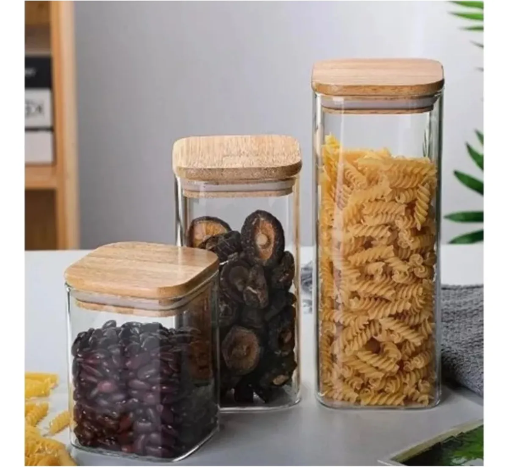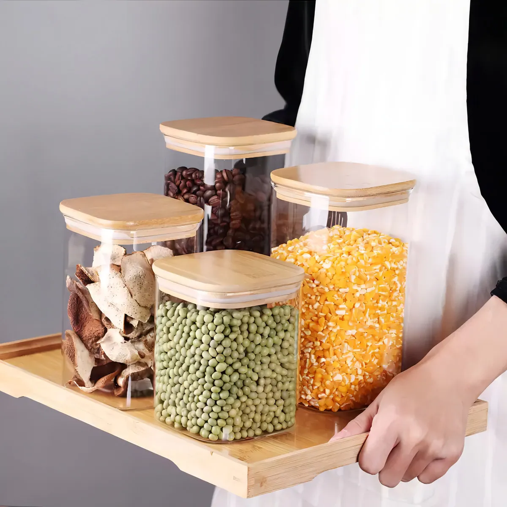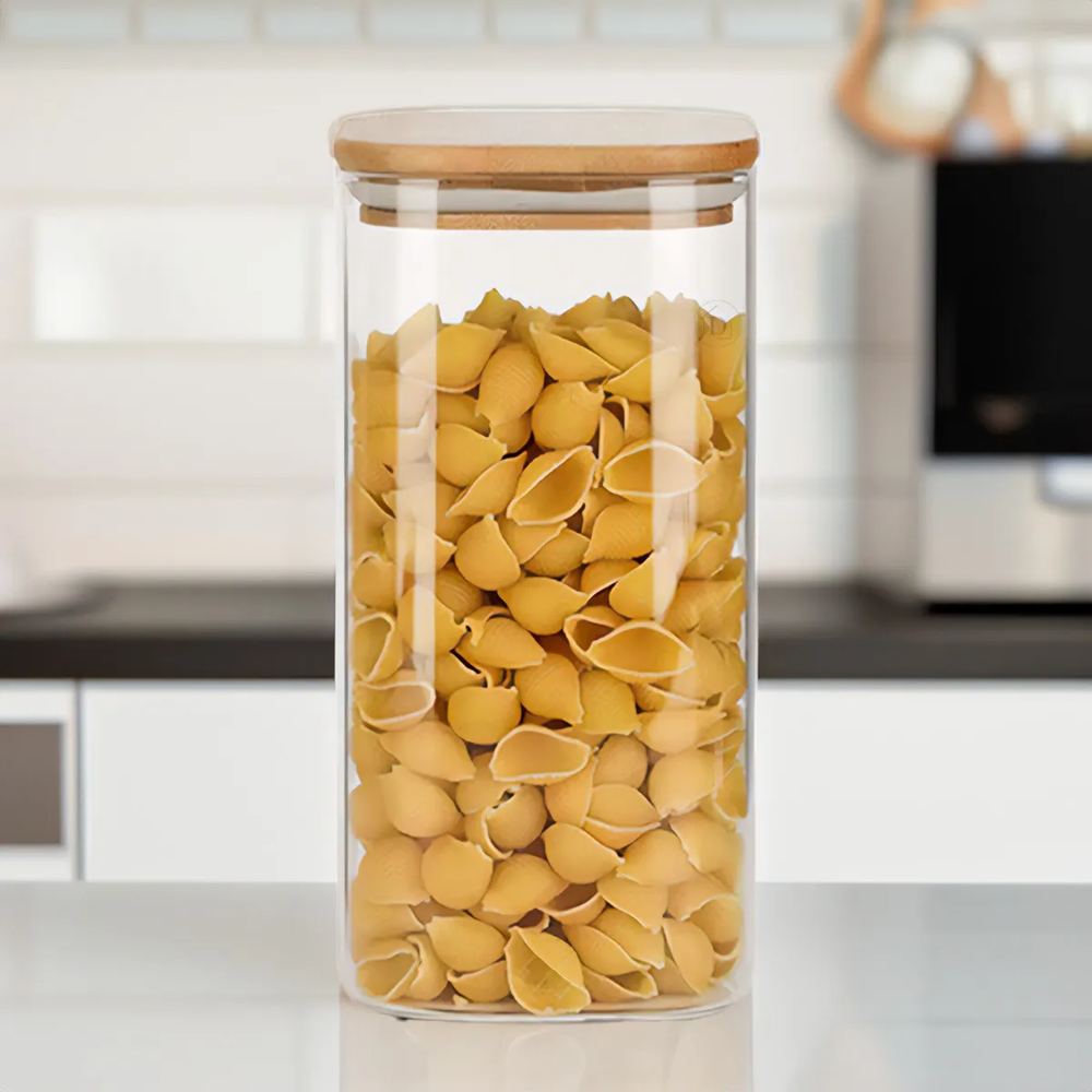 Un equilibrio perfecto entre estilo y funcionalidad. Este elegante frasco de vidrio transparente con tapa cuadrada de bambú natural aporta un toque minimalista y sofisticado a tu cocina o despensa. Ideal para almacenar granos, café, té o snacks, manteniendo todo fresco